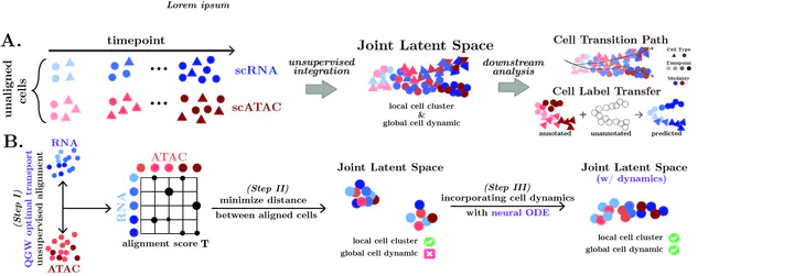 Visualization of scNODEscNODE is a generative model that simulates and predicts realistic in silico single-cell gene expressions at any timepoint. scNODE integrates the idea of variational autoencoder (VAE) and neural ordinary differential equation (ODE) to model cell developmental landscapes on the non-linear manifold.
