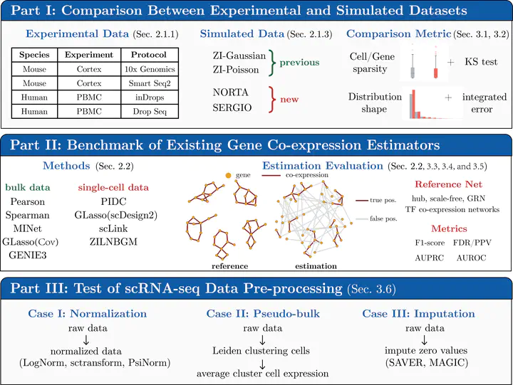 With the rapid advance of single-cell RNA sequencing (scRNA-seq) technology, understanding biological processes at a more refined single-cell level is becoming possible. Gene co-expression estimation is an essential step in this direction. It can annotate functionalities of unknown genes or construct the basis of gene regulatory network inference. This study thoroughly tests the existing gene co-expression estimation methods on simulation datasets with known ground truth co-expression networks. We generate these novel datasets using two simulation processes that use the parameters learned from the experimental data. We demonstrate that these simulations better capture the underlying properties of the real-world single-cell datasets than previously tested simulations for the task. Our performance results on tens of simulated and eight experimental datasets show that all methods produce estimations with a high false discovery rate potentially caused by high-sparsity levels in the data. Finally, we find that commonly used pre-processing approaches, such as normalization and imputation, do not improve the co-expression estimation. Overall, our benchmark setup contributes to the co-expression estimator development, and our study provides valuable insights for the community of single-cell data analyses. Codes are available at https://github.com/rsinghlab/scRNAseq_Coexpression_Benchmark.